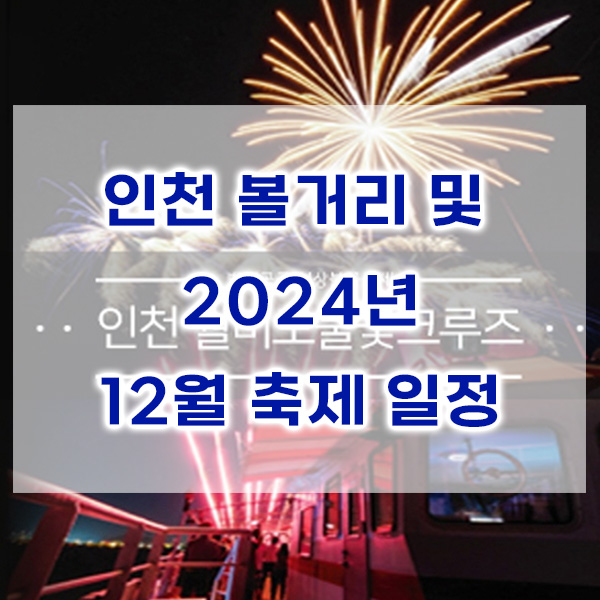 안녕하세요, Ryallist의 Royal입니다.오늘은 인천 볼거리 및 인천 12월 축제에 대해서 소개시켜 드리려고 합니다!인천에서 하는 축제에 가실분은 이 포스팅이 많은 도움이 되시길 바랍니다^^★ 월미도 불꽃크루즈기간 : 2023.01.01 - 2024.12.31 지역 : 인천광역시 중구 월미문화로 21 / 북성동1가 98-251 정보대인 35,000원 소인 22,000원(금액 변동 있음) 1522-8905 크루즈 위에서 즐기는 가장 가까운 불꽃축제! 다양한 선상 공연과 국내유람선 최초 3D영상쇼 그리고 피날레 불꽃축제까지 한번에 즐길 수 있다. 시즌별로 테마와 불꽃축제 음악, 영상쇼가 변경된다. 매주 토요일 저녁 월미도 선착장에서 출발한다. 크루즈스토리 크루즈스토리안전이 검증된 전국 불꽃크루즈 ..